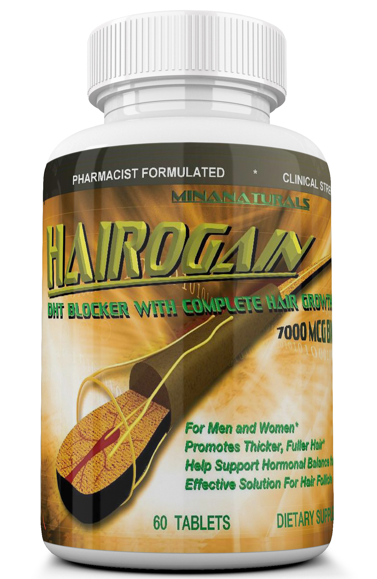 Formula (2115 Mg). Support Hair Growth. 7000ug Biotin, Collagen and Hair Vitamins Added. Help Decrease Hair loss And Baldness. HAIROGAINE formula is developed by our pharmacist with our research team. Our formula uniquely blend essential vitamins, minerals and herbal ingredients in amounts which clinically proved to be effective and safe. Our goal was to work on each reason for hair thinning and address it with an effective, natural and safe method. We have incorporated a powerful anti-oxidant in the formula to help fight the damaging effect of free radicals and to make the new hair shaft revive. Our herbal blend mainly help to neutralize the excess DHT which is one of the main reasons for baldness in a lot of people. We even added ready forms of nutrients like collagen to enhance the shine and nourish the new keratinic hair structure. We have added 7000 Mcg of Biotin and Pantothenic acid to the formula to enhance the hair follicle..